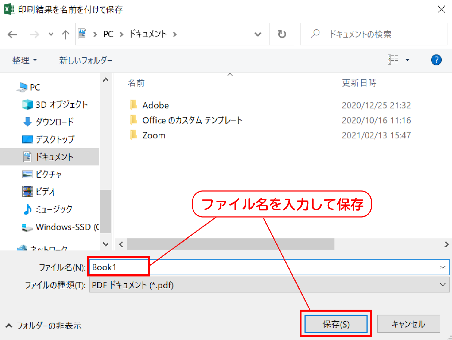 「名前を付けて保存」画面で、ファイルの種類に「PDF」を選択します。