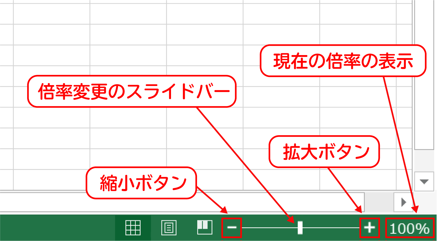 エクセルの右下には、表示倍率を変更するボタンがあります。ここで「+」の拡大ボタンや、「-」の縮小ボタンを押したり、真ん中のスライドバーを移動させることで、表示倍率を変更することが出来ます。