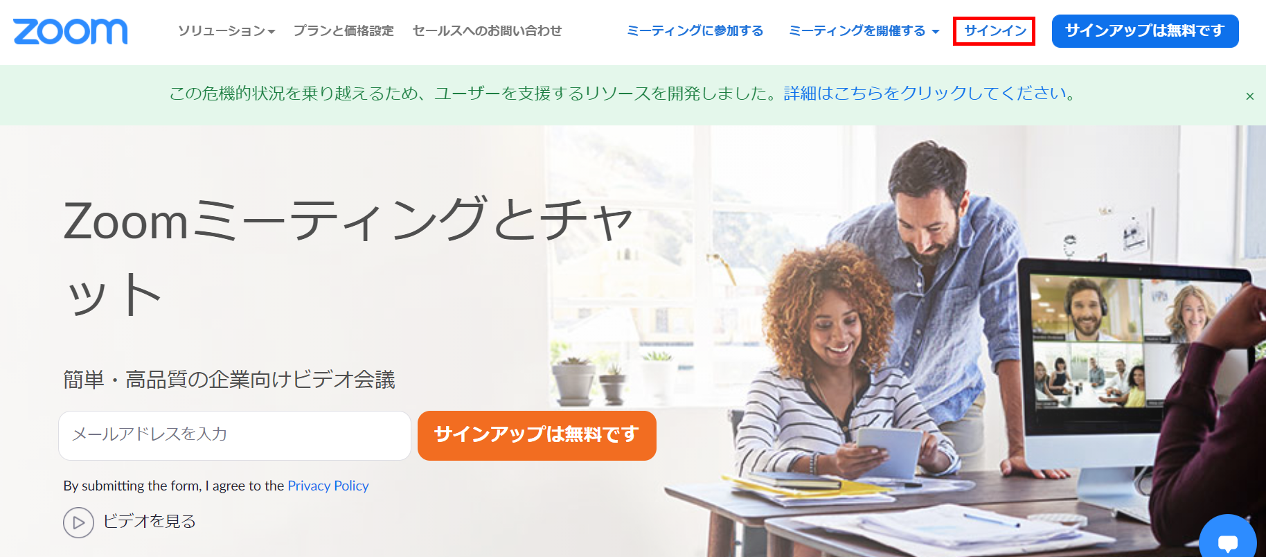 Zoomにホストのアカウントでサインインします。Zoomのサイト右上にある「サインイン」のリンクから入ります。