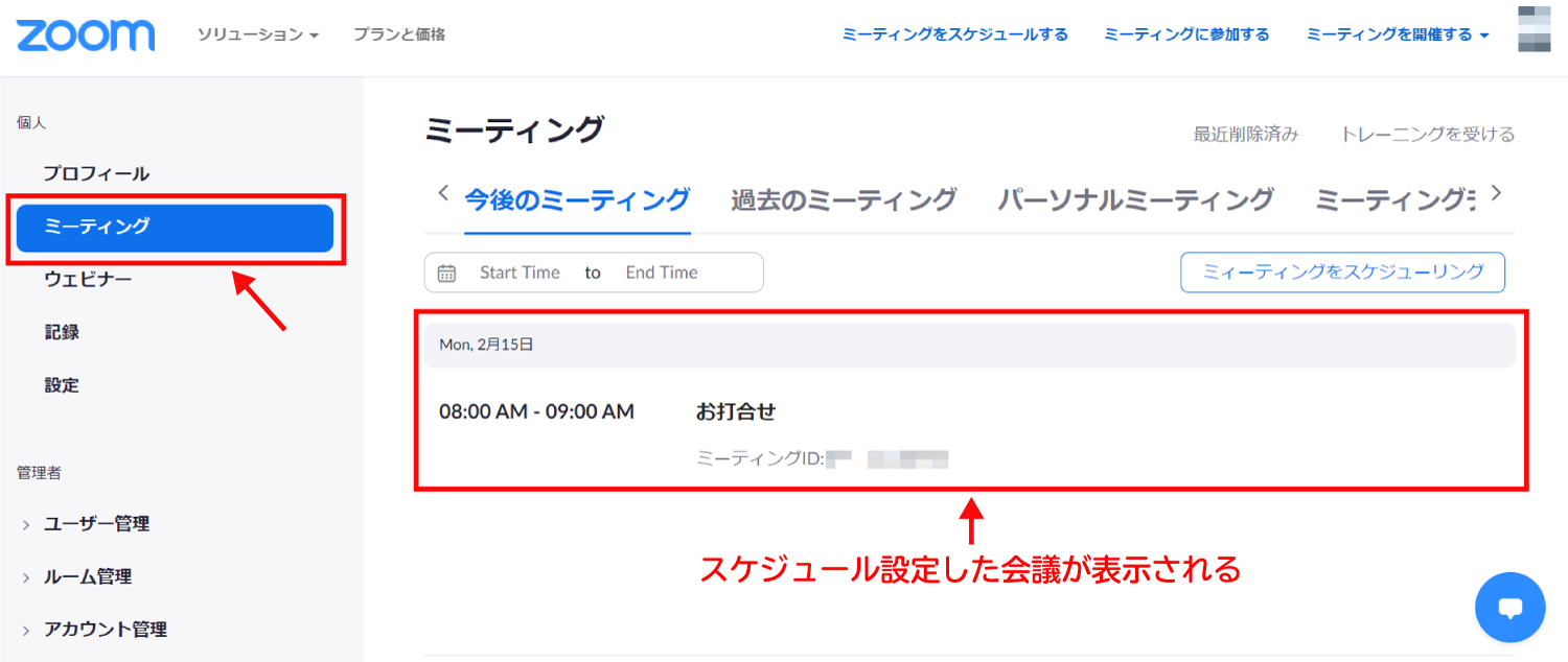 Zoomのホームページにサインインして「ミーティング」のページを開くと、スケジュール設定した会議が表示されます。